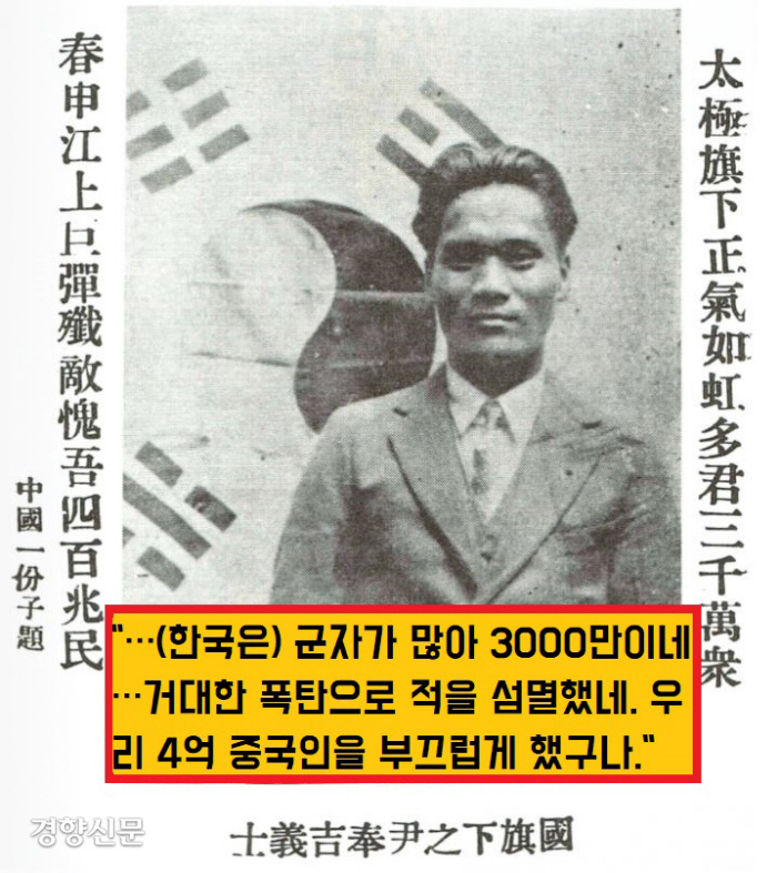 1932년 백범 김구가 펴낸 <도왜실기>의 윤의사 사진에는 한 중국인의 시가 붙어있는데요. ‘국기 아래의 윤봉길 의사’ 라는 제목의 한시는 “한국에는 군자가 많이 3000만인데…거대한 폭탄으로 적을 섬멸했으니 4억 중국인을 부끄럽게 했다”고 추앙했습니다. 난징(南京)의 <대정보>는 윤봉길을 ‘흉수(兇手·악인)’로 폄훼한 일부 신문의 논조를 비판하면서 “윤봉길은 열사이자 협객”이라고 치켜세웠습니다. 윤의사의 사형소식이 알려진 9월 중국인들의 추모열기는 대단했습니다.