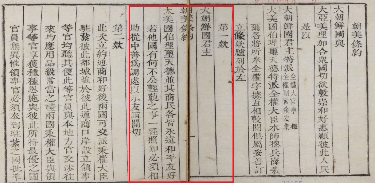 반면 조선의 태도는 180도 바뀌었다. 결사항전 의지로 전쟁까지 벌이며 문을 닫아 걸었던 10여년전과 달리 조선은 미국을 ‘메시아’로 여겼다. 1882년(고종 19년) 맺은 조미 통상조약의 제1조가 다름아닌 “제3국이 한쪽 정부에 부당하게, 억압적으로 행동할 때 다른 한쪽 정부가 원만한 타결을 위해 주선한다”는 ‘거중조정 조항’이었다. 조선이 남의 나라로부터 간섭이나 침략을 받을 때는 미국이 적극 나선다는 것이었다. 미국은 적국에서 ‘아름다울 미(美)자’ 미국으로 바뀌었다. 하지만 그것도 잠시였다.