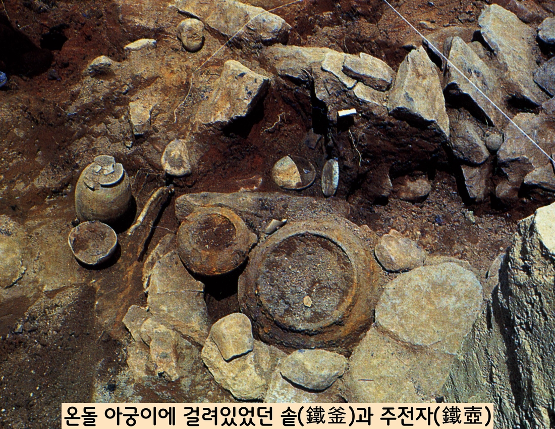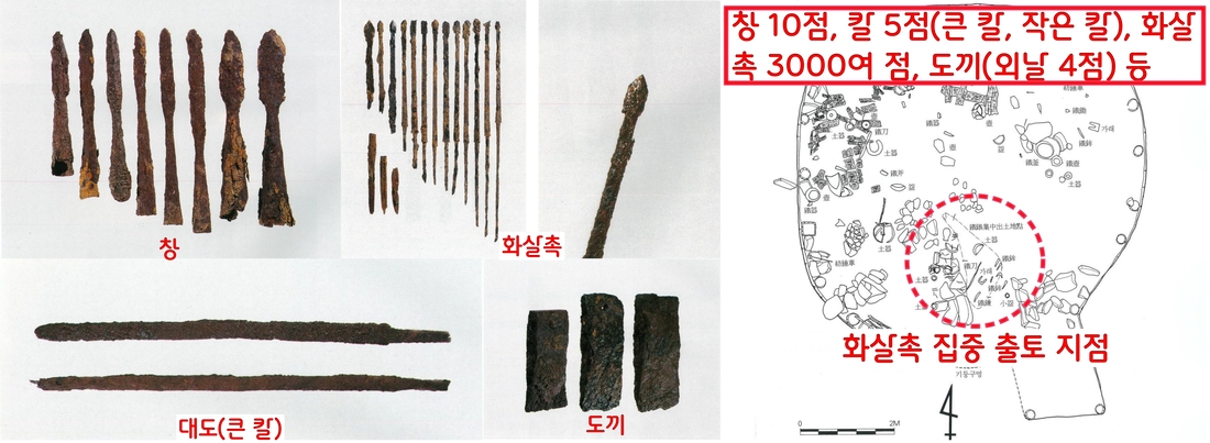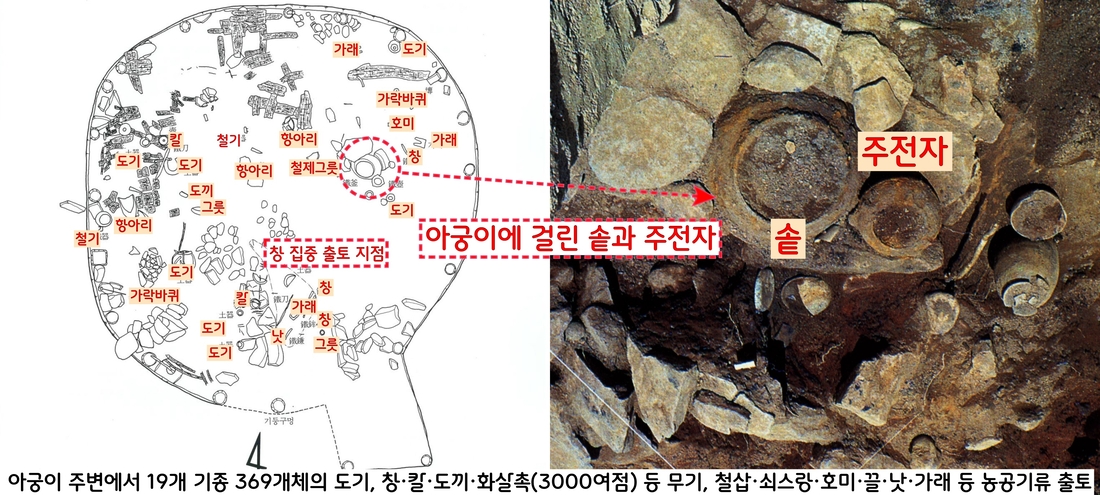 그 주변에는 19개 기종 369개체의 도기와, 창·칼·도끼·화살촉 등 무기, 철삽·쇠스랑·호미·끌·낫·가래 등 농공기류 등 철기(화살촉 3000여점+15개 기종 50여 점)가 고스란히 놓여 있었다. 전소된 흔적이 완연했다. 불을 서둘러 끄려던 진화의 흔적도 없었다. 불에 타고 난 뒤 흙으로 덮은 것이 확실했다.
