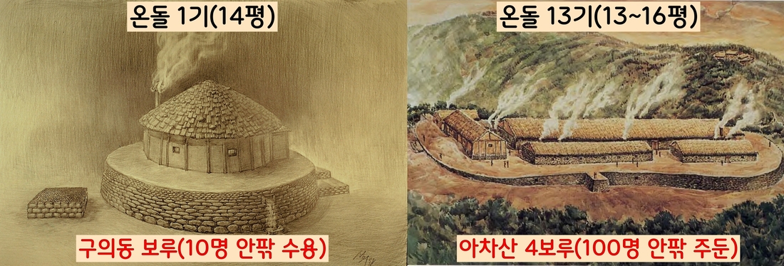 아차산 4보루의 온돌방 규모는 13~16평 정도이다. 구의동 보루의 온돌방(14평)과 비슷하다. 그렇다면 어떨까. 구의동 보루에서처럼 온돌 1기에 10명 안팎이 살았다면 아차산 4보루의 주둔군 수는 100명 정도로 추산할 수 있다. <신당서>(‘병지’)는 “부대의 최소단위인 ‘화(火)’는 10명, ‘대(隊)’는 ‘화’를 5개 합친 50명…”이라 했다. 구의동엔 ‘1개 화(火·10명)’, 아차산 4보루에는 ‘2개 대(隊·100명)’가 각각 주둔했다는 얘기다.