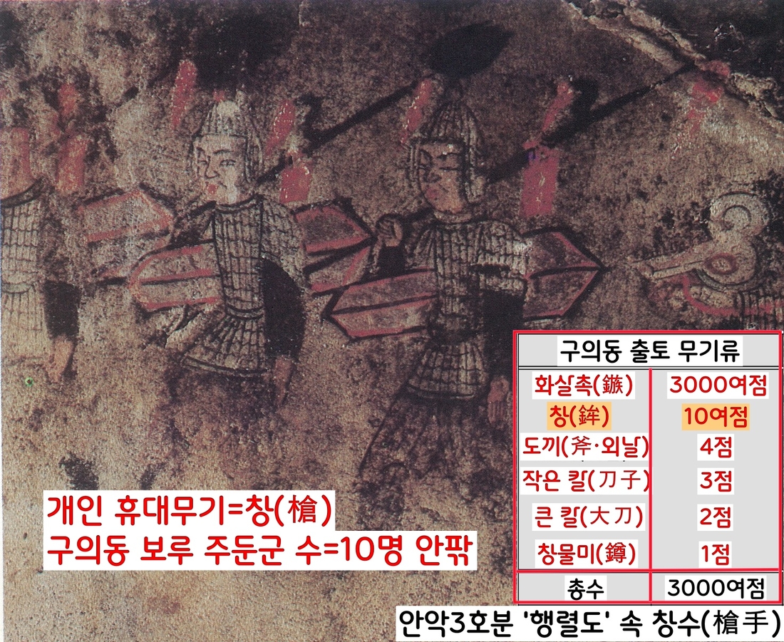고구려 벽화(무용총·덕흥리 고분 등)에서 보듯 ‘말 타고 되돌아쏘기(파르티안 샷) 신공’ 등 활쏘기는 기본기 중의 기본기였다. 그렇다면 구의동 병사들은 개인당 창 1점과, 활과 화살 300발을 기본 개인화기로 휴대했을 것이다. 칼과 도끼는 보조무기였을 것이다. 이들은 원거리 전투엔 궁술로, 근접전엔 창과 칼로 적군과 맞서 싸웠을 것이다.