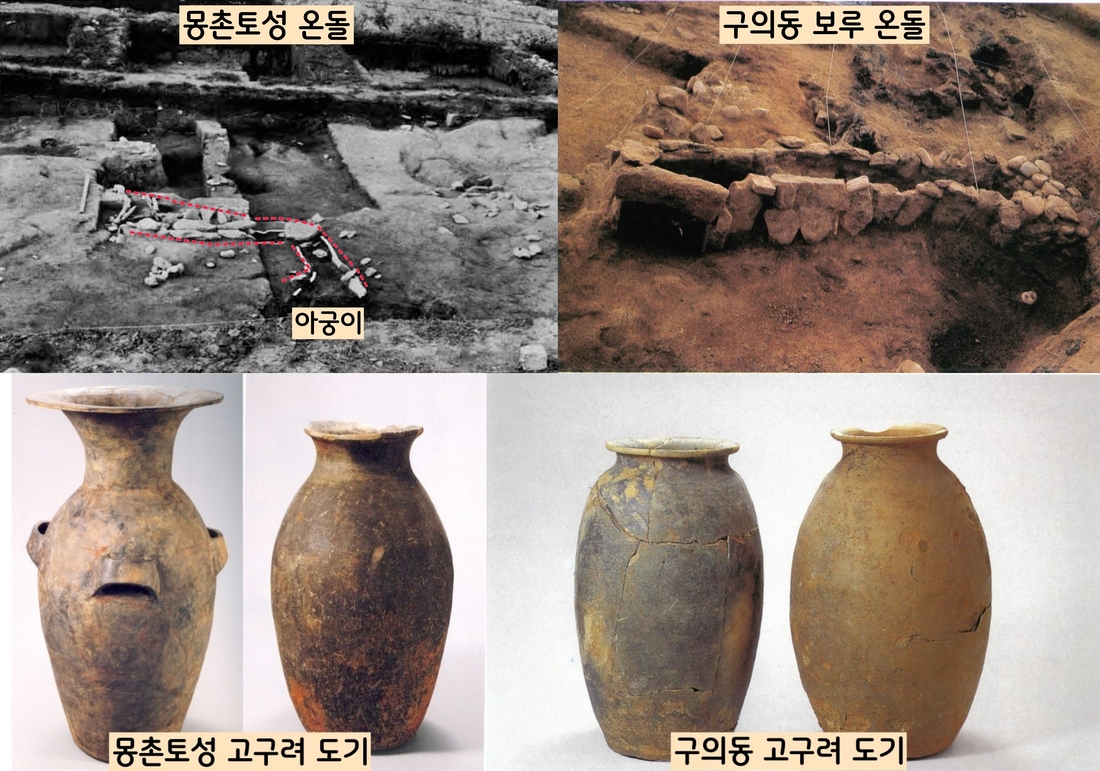 1980년대 중반부터 시작된 한강 이남의 몽촌토성에서 전형적인 고구려 도기가 확인됐다. 백제고분이라던 구의동 유적에서 확인된 것과 같은 기종이었다. 몽촌토성에서는 구의동의 것과 비슷한 고구려식 온돌이 확인됐다. 이로써 한강 이남과 이북에 고구려 유적이 존재했음이 분명해졌다.|최종택 고려대 교수 제공