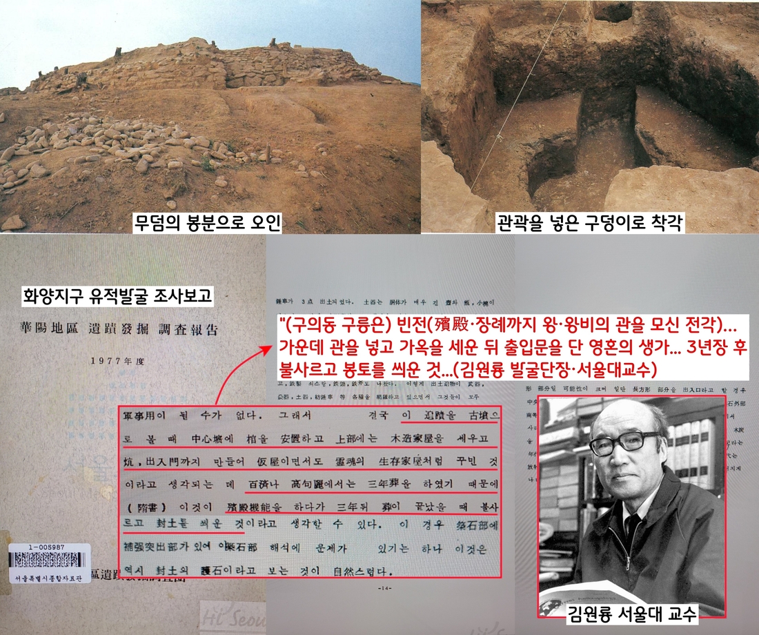 당시 발굴을 끝낸 김원룡 발굴단장(서울대 교수)은 “이 구릉은 빈전(殯殿·장례까지 왕·왕비의 관을 모신 전각)…가운데 관을 넣고 가옥을 세운 뒤 출입문을 단 영혼의 생가”로 보고했다. 유구의 형태를 무덤의 봉분으로, 유구 가운데 조성된 구덩이를 관곽을 넣은 공간으로 오인한 것이다.|화양지구 보고서