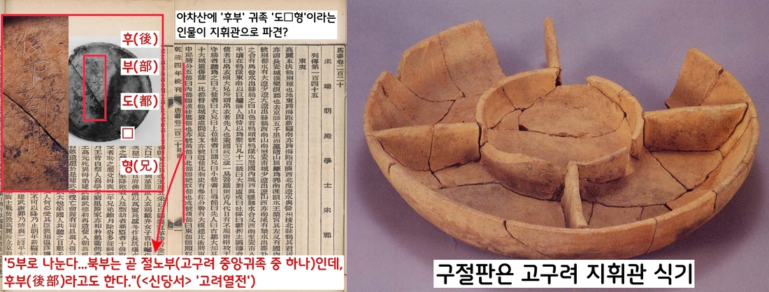 그렇다면 아차산에 이 오부 중 ‘후부’ 소속인 ‘도□형’이라는 귀족이 지휘관으로 파견되었을 가능성도 있다. ‘형(兄)’자 돌림은 인명일 수도, 관등명일 수도 있다. 어쨌든 아차산 4보루에서 출토된 구절판은 이 보루의 지휘관급 식판이었을 가능성이 짙다. 이 구절판의 바깥 바닥면에 새겨진 ‘대(大)’자는 바로 “내 식판이니까 건들지마”라는 식별문자일 가능성이 짙다.
