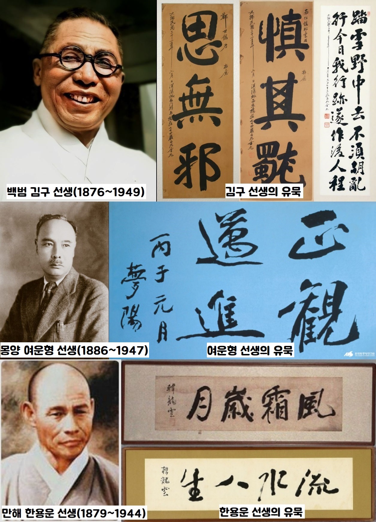 백범 김구 선생와 몽영 여운형 선생, 만해 한용운 선생의 유묵. 이중 백범의 &lsquo;사무사&rsquo;와 &lsquo;신기독&rsquo;은 등록문화재로 지정되어 있다. 독립정신이 깃든 이 분들의 유묵도 향후 국가지정문화재의 대접을 받아 마땅하다는 평을 듣고 있다
