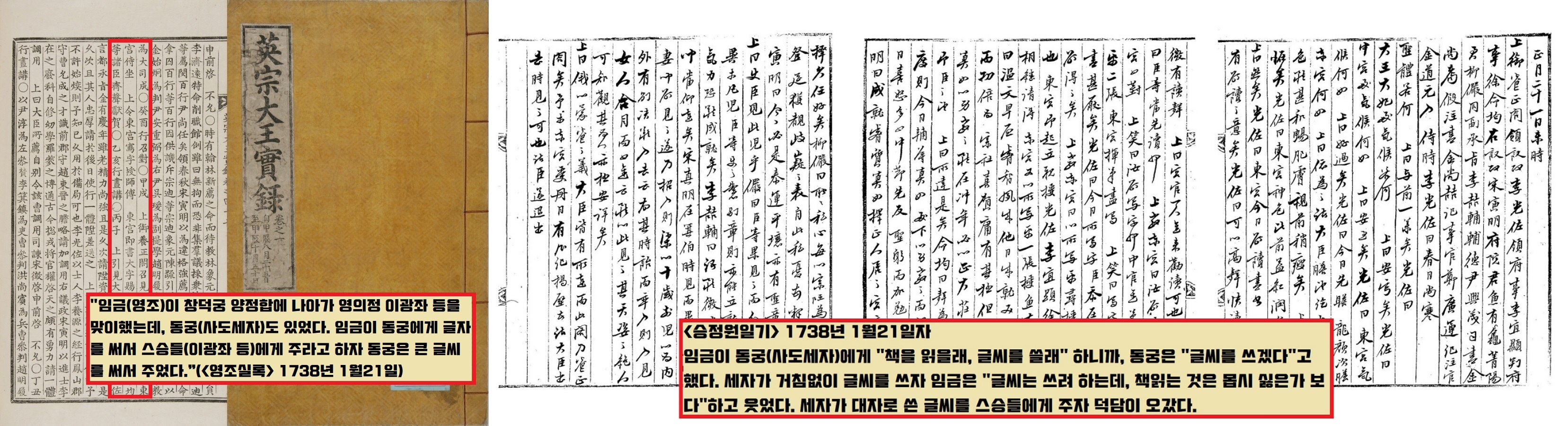 <영조실록> 1738년 1월21일과 같은 날짜 <승정원일기> 기술내용. 실록은 “영조가 창덕궁 양정합에 나가 동궁(사도세자)과 동궁의 스승인 이광좌 등을 보았다. 동궁은 임금의 명에 따라 큰 글자를 써서 스승인 이광좌 등에게 주었다”는 내용을 담고 있다. 그러나 <승정원일기>는 현장상황을 생생한 필치로 자세하게 묘사했다. 영조는 세자에게 “책을 읽겠느냐”고 묻고 세자가 대답을 하지 않자 “그럼 글씨를 쓰겠느냐”고 물었다. 세자가 붓을 들어 글씨를 써내려가자 영조는 “글씨는 쓰려하는데, 책은 읽기 싫어하는가 보다”하며 웃었다.