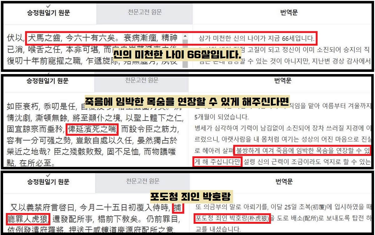 5년 전에 비해 상당부분 진전됐더라구요. ‘60세’로 잘못 읽었던 것을 ‘66세’로, ‘목숨을 연장하게 해야 합니다’를 ‘목숨을 연장하게 하옵소서’로, ‘포도청 죄인 호린’을 ‘호도청 죄인 박호랑’이라고 정확히 고쳐 읽었더라구요.