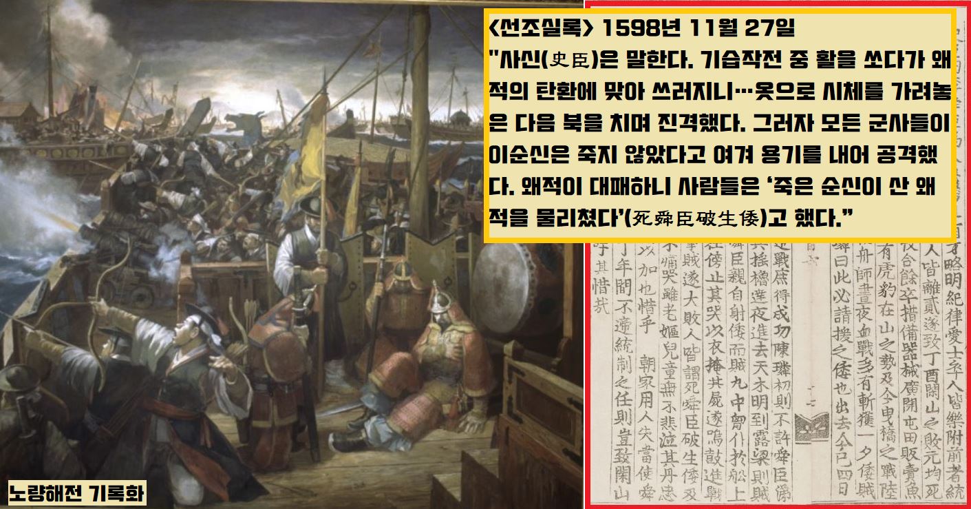 <선조실록> 1598년(선조 31) 11월27일자를 봅시다. 좌의정 이덕형(1561~1613)이 8일전(19일) 벌어진 이순신 장군(1545~1598)의 노량해전 전공을 선조(1567~1608)에게 보고하는 내용을 실었습니다. 그런데 실록의 사관이 사론을 달아 이순신 장군의 최후를 생생한 필치로 전합니다.