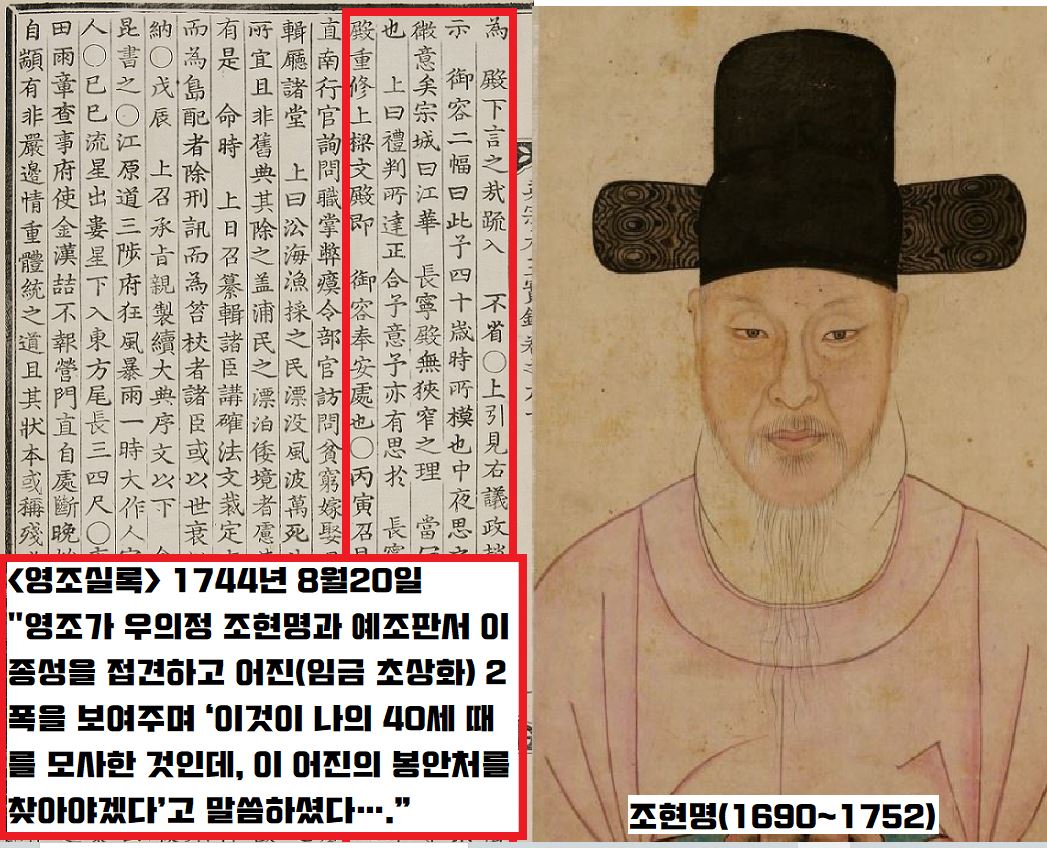 “영조가 우의정 조현명(1690~1752)과 예조판서 이종성(1692~1759)을 접견하고 어진(임금 초상화) 2폭을 보여주며 ‘이것이 나의 40세 때를 모사한 것인데, 이 어진의 봉안처를 찾아야겠다’고 말씀하셨다…”