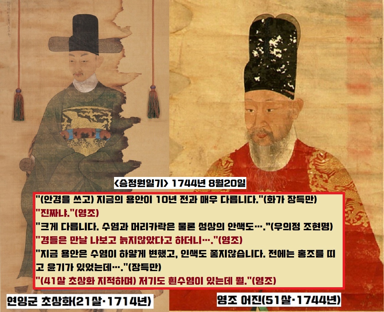 51살이 된 영조가 41살 때 그린 당신의 초상화를 가져와 신하들과 품평회를 열었다는 내용을 아주 상세하게 묘사합니다.
