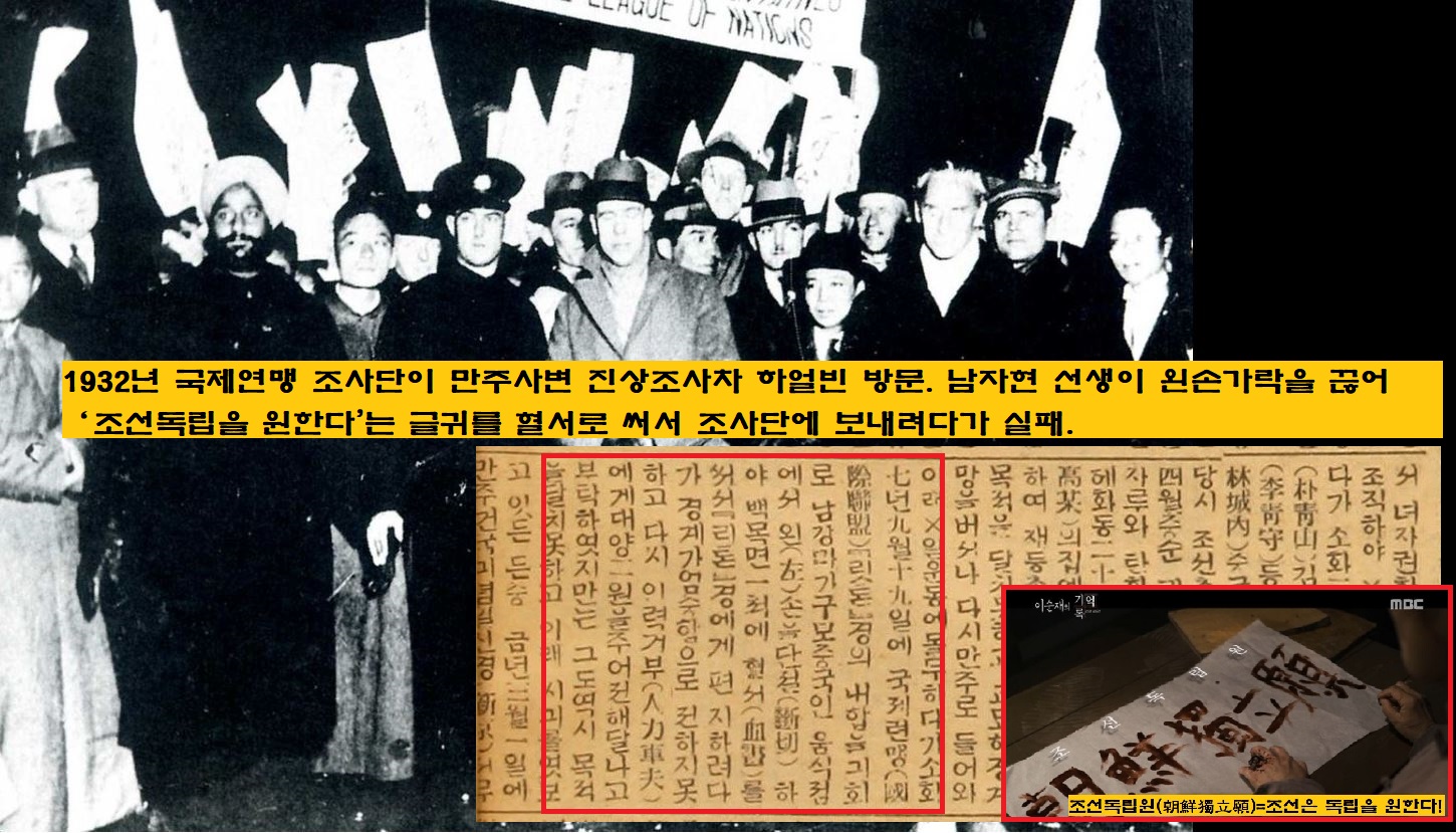 만주사변을 일으킨(1931년) 일제가 괴뢰국(만주국·1932년)을 세우자 국제연맹은 하얼빈(哈爾濱)에 조사단(리턴조사단)을 파견합니다. 선생은 이때야말로 조선의 상황을 알릴 기회라고 여깁니다. 선생은 왼쪽 가운데 손가락을 끊어 무명천에 ‘조선은 독립을 원한다’(朝鮮獨立願’)이라는 혈서를 써서 조사단에게 보내려 합니다. 삼엄한 경비를 뚫지 못하자 인력거꾼에게 돈을 주고 리턴조사단에 전달하려 합니다. 그러나 그마저 실패로 돌아갑니다.