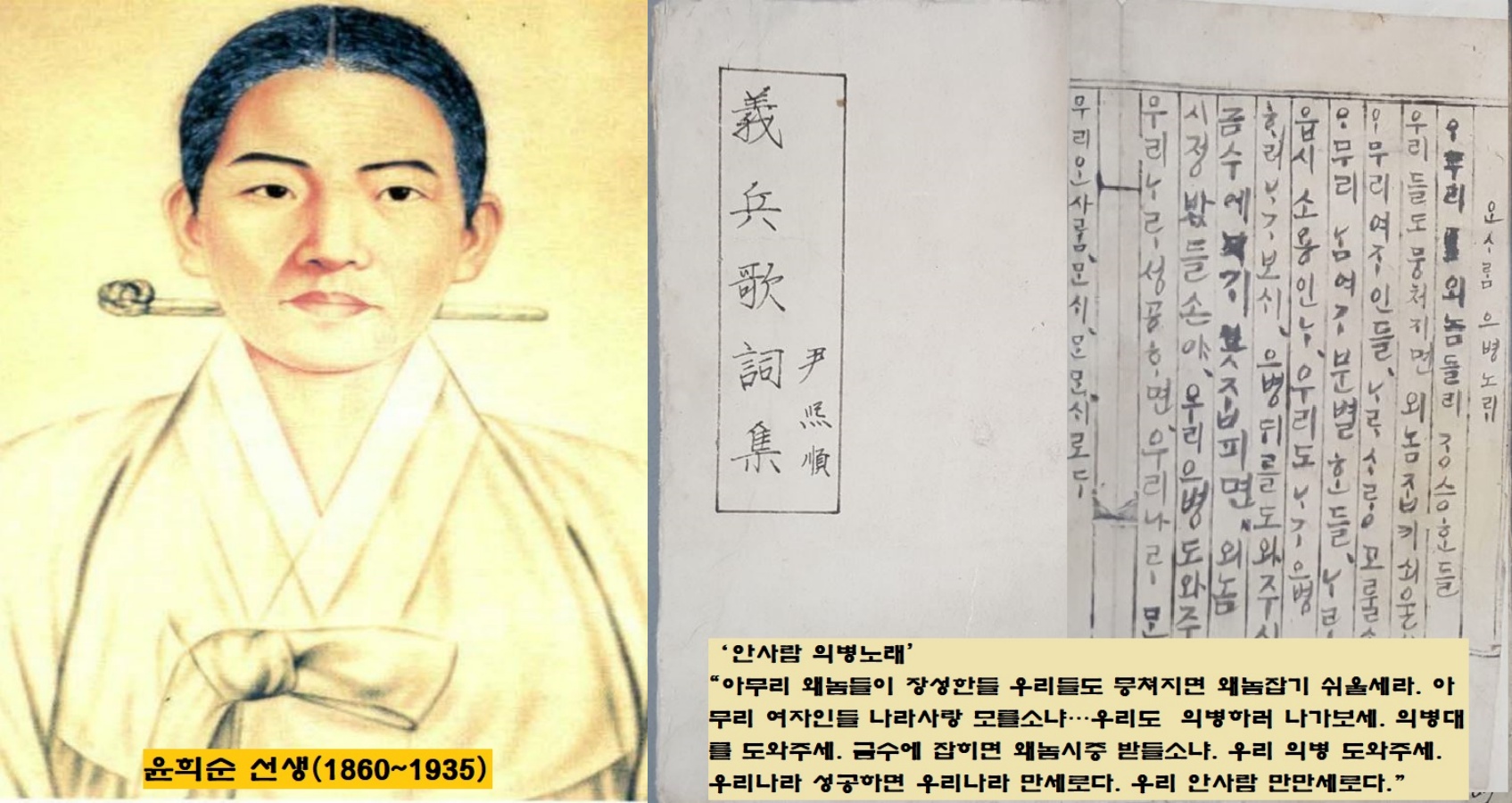 “아무리 왜놈들이 강성한들 우리들도 뭉쳐지면 왜놈잡기 쉬울세라. 아무리 여자인들 나라 사랑 모를소냐. 아무리 남녀가 유별한들 나라없이 소용있냐. 우리도 의병하러 나가보세…”