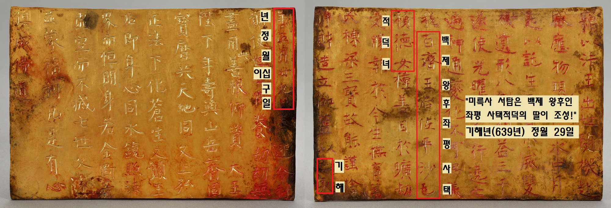 “백제 왕후인…좌평 사택적덕의 딸이…재물을 희사해서 가람을 세우시고…기해년(639년) 정월 29일 사리를 받들어 맞이했다.”