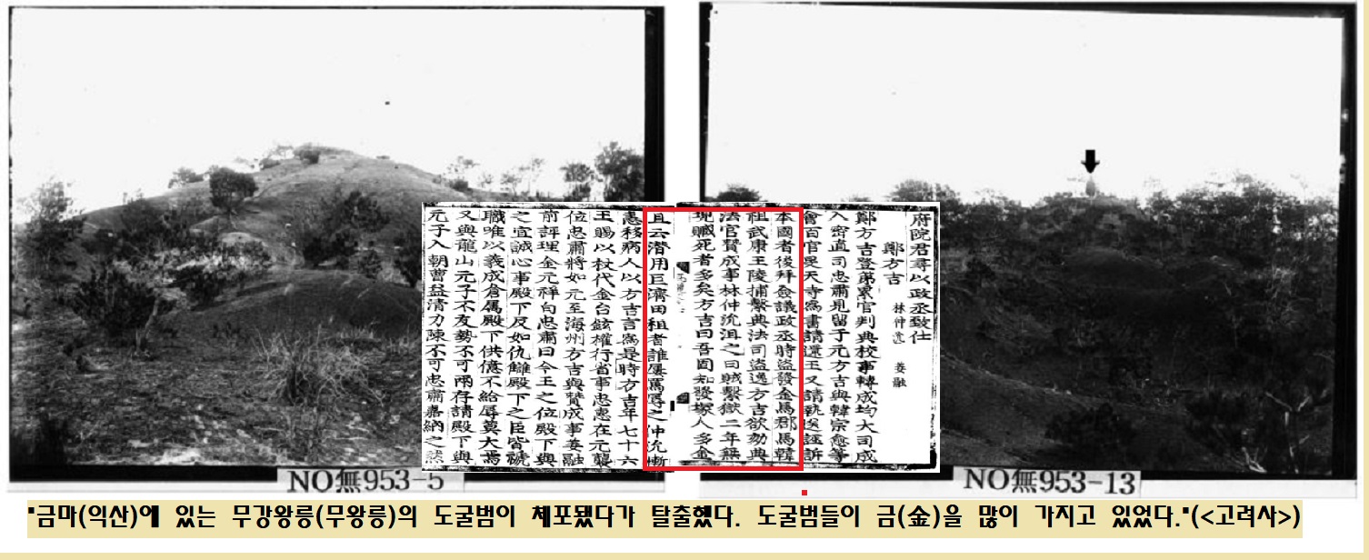 “1329년(충숙왕 16년) 익산(금마군)의 무강왕(무왕)의 무덤을 도굴한 도적이 금을 많이 갖고 있다”는 <고려사> ‘열전·정방길’의 기록이 남아있습니다. 아닌게 아니라 2017년 국립문화재연구소의 소왕릉 발굴에서 일제강점기 이전에 만들어진 길이 68㎝, 높이 45㎝ 정도의 도굴 구덩이가 확인됐습니다.
