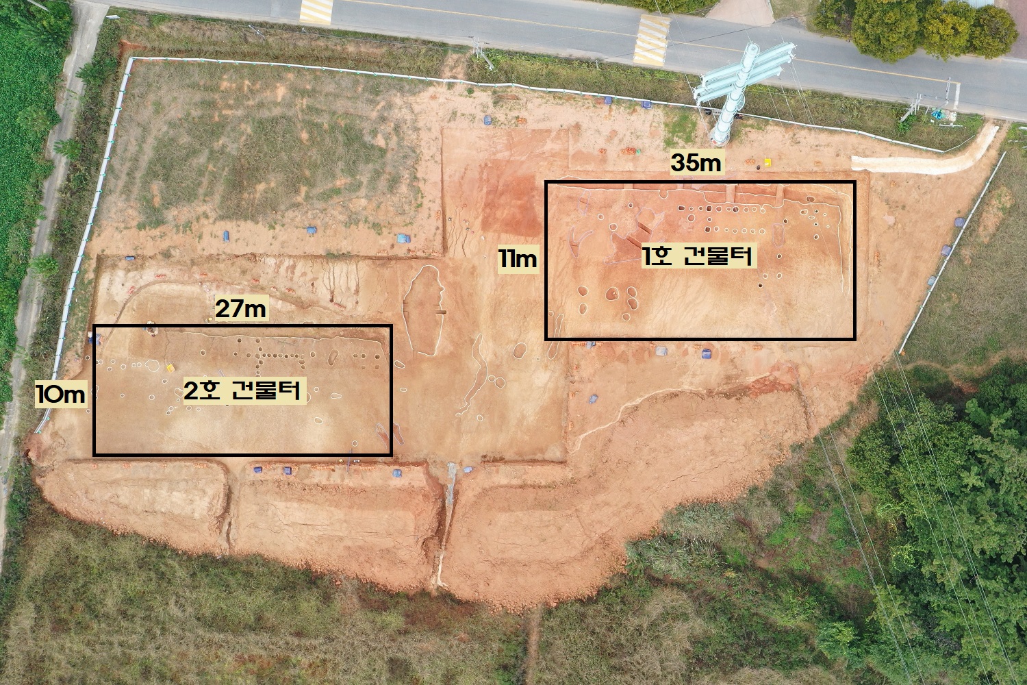 30m 안팎에 이르는 대형건물지 2동의 흔적이었습니다. 기둥을 이용한 건물 안에서는 역시 벼루조각, 대형 토기편, 인장이 찍힌 기와 등이 보였습니다. 그런데 80~117평 정도의 만만치 않은 건물터에는 부뚜막 시설은 없었습니다. 발굴단은 그래서 이 건물 2동은 일반거주시설이 아니라 쌍릉과 연관된 제사시설이 아닐까 추정했습니다.