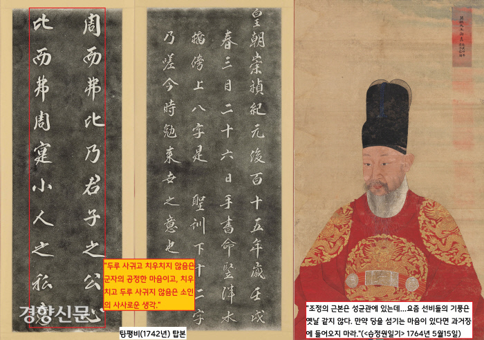 1742년 성균관에 세운 ‘탕평비’에 ‘탕평의 의지’를 담았습니다. “두루 사귀고 치우치지 않음은 군자의 공정한 마음이고, 치우치고 두루 사귀지 않음은 소인의 사사로운 생각”(탕평비)이라고 했죠. 성균관 유생들에게 “…만약 당을 섬기는 마음이 있다면 과거장에 들어오지 마라”(<승정원일기> 1764년 5월14일)고 재차 훈계했습니다.