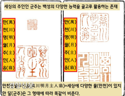 ‘탕평’ 관련 장서인 중에 ‘만천명월주인옹(萬川明月主人翁)’이 있다. “세상에 다양한 물(만천)이 있지만 달(군주)은 그 형태에 따라 똑같이 비춘다”는 뜻이다. 즉 세상의 주인인 군주는 백성의 다양한 능력을 골고루 활용하는 존재라는 것이다.|규장각한국학연구원 소장