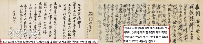 정조가 재상인 심환지(1730~1802)에게 보낸 편지가 특히 눈에 띄는데요. 심환지는 정조의 아버지인 사도세자(1735~1762)의 죽임이 정당했다고 주장한 노론 벽파의 영수였죠. 그래서 정조와 대립각을 세운 인물로 알려졌는데요.