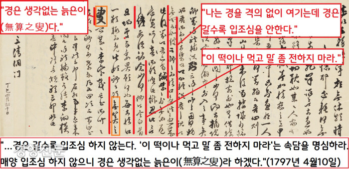 “나는 경(심환지)을 이처럼 격의없이 여기는데 경은 갈수록 입조심 하지 않는다. ‘이 떡이나 먹고 말 좀 전하지 마라’는 속담을 명심하라. 매양 입조심 하지 않으니 경은 생각없는 늙은이(無算之수)라 하겠다.”(1797년 4월10일)