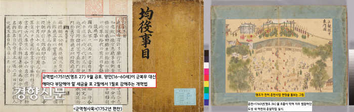 영조의 가장 큰 치적은 균역법과 준천(하천 준설사업)이었다. 1751년 9월 시행된 균역법에 따라 양인이 군복무 대신 해마다 부담해야 할 세금이 포2필에서 1필로 줄어들었다. 또한 물 흐름이 자주 막혀 범람하기 일쑤였던 도성내 하천의 준설공사도 펼쳤다. |국립중앙박물관·규장각한국학연구원 소장