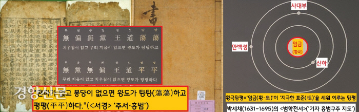 ‘홍범’은 ‘홍범구주’의 준말이고요. 하나라 우왕이 하늘의 뜻에 따라 정한 ‘9개 조목(九疇·구주)의 큰 법(洪範·홍범)’을 가리킵니다. 그중 5번째 조목인 ‘황극(皇極)’에 ‘탕탕평평’ 구절이 나옵니다. 그런데 이 ‘탕탕평평’의 핵심조건이 있습니다.