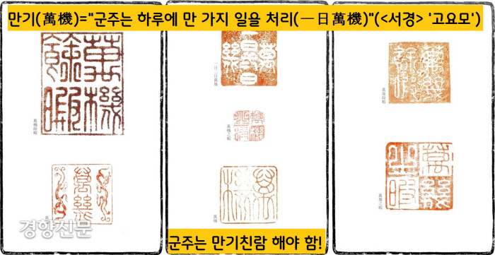 정조의 ‘장서인’ 중에는 ‘만기(萬機)’가 많다. ‘만기’는 “천자(군주)는 하루에 만가지 일을 처리한다(일일만기·一日萬機)’(<서경> ‘고요모’)는데서 유래됐다. ‘만기친람’이 여기서 나왔다.|규장각한국학연구원 소장