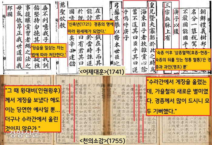 영조는 경종 승하와 관련된 각종 의혹을 강력 부인하고 당신의 입장을 밝힌 <어제대훈>을 펴냅니다. 영조는 “효종-현종-숙종의 혈통을 잇는 이는 경종과 과인(영조) 뿐이며, 신축년(1721년) 경종의 명으로 왕세제가 된 것”이라고 굳이 밝힙니다.
