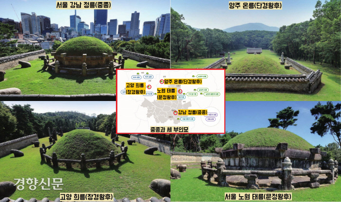 결국 남편과 세 부인은 서울 강남 정릉(남편 중종)과 양주 온릉(단경왕후)·고양 희릉(장경왕후)·노원 태릉(문정왕후) 등 뿔뿔이 흩어지게 되었네요. ‘이산가족’이 됐습니다.