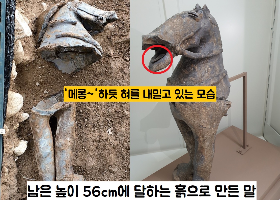 ‘주인공=유아’임을 유추할 수 있는 또다른 단서죠. 또 남은 높이가 56㎝에 달하는 압도적인 크기의 말모양 도기도 출토되었는데요. 이 말은 ‘메롱’하듯 혀를 쑥 내밀고 있어요. 꼭 어린왕자와 장난을 치듯이 말입니다.