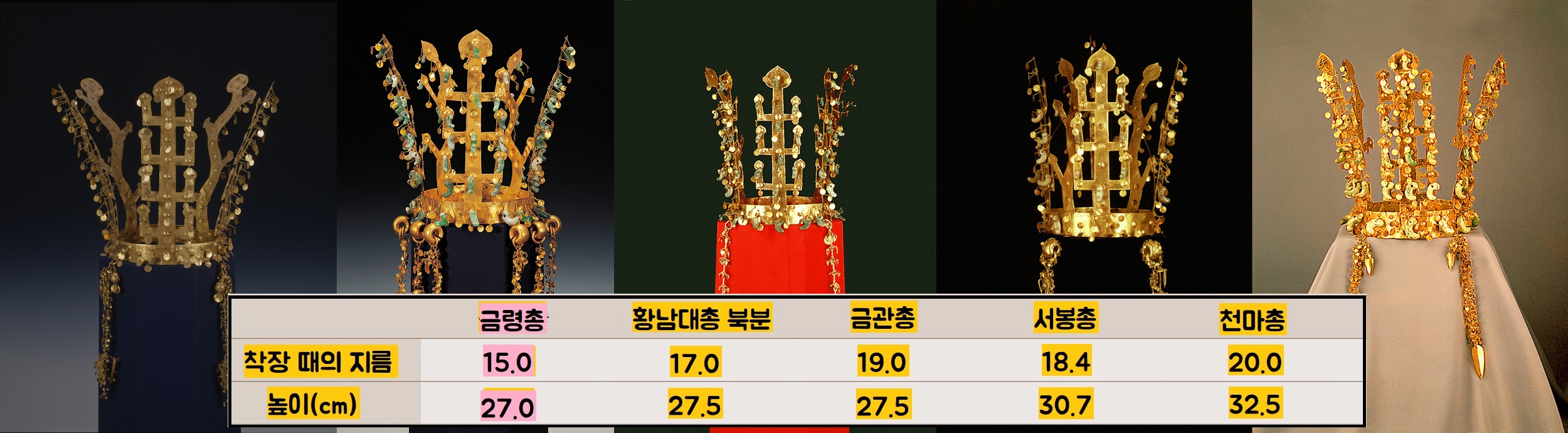 금관의 크기를 볼까요. 주인공이 착장한 상태의 금관 지름(15㎝)이 다른 고분의 출토품(천마총 20㎝, 금관총 19㎝, 서봉총 18.4㎝)보다 작고요. 특히 금령총 금관(관테 53㎝, 높이 27㎝)은 거의 동시대에 조성된 천마총의 금관(관테 64㎝, 높이 32.5㎝)보다 훨씬 작습니다. 한마디로 머리통이 작다는 얘기죠.