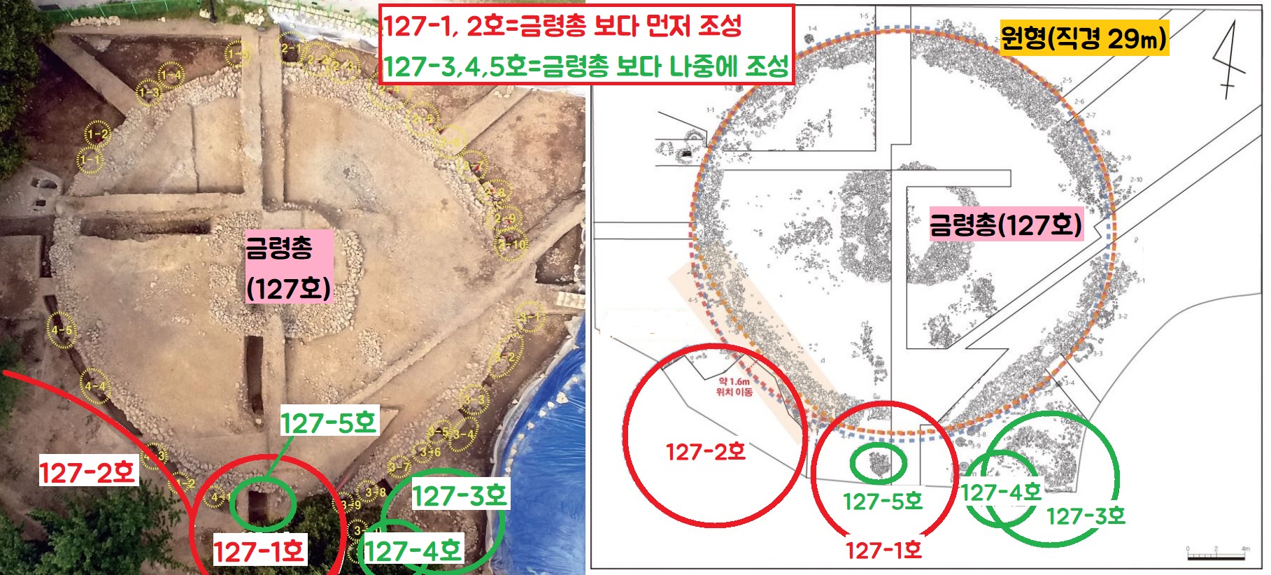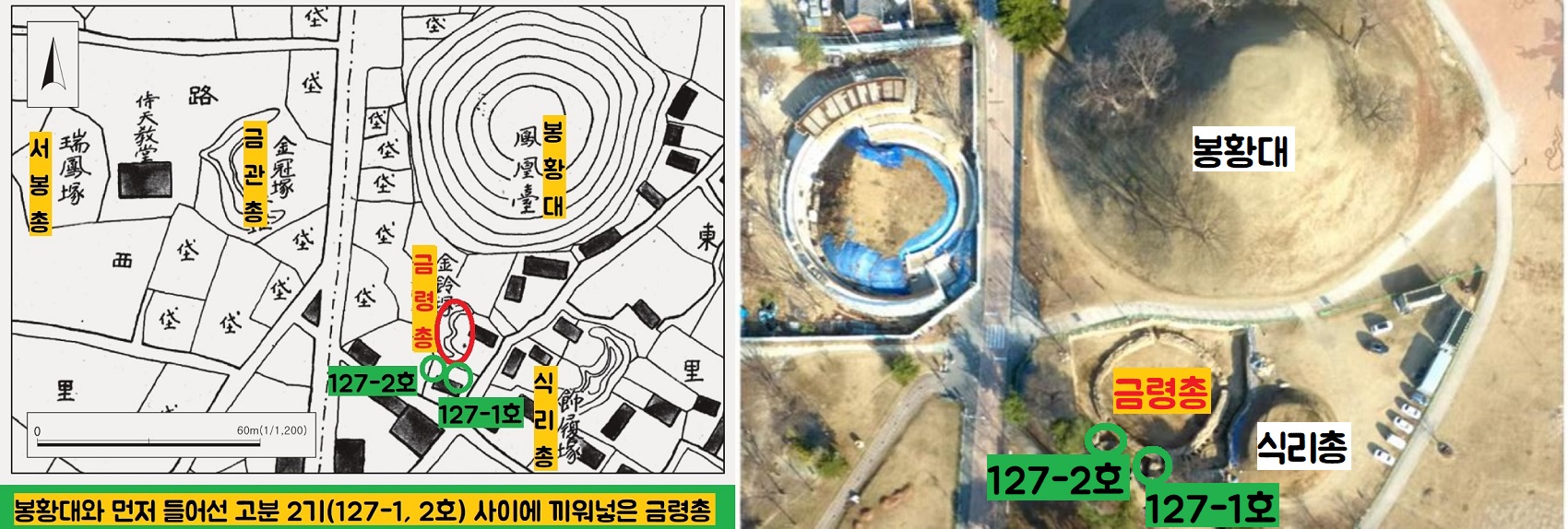 2018년부터 국립경주박물관이 금령총을 재발굴했습니다. 그 결과 봉황대와, 기존에 이미 조성되어 있던 고분 2기(127-1호, 127-2호) 사이에 금령총을 비집고 끼워 넣은 것으로 파악했습니다.