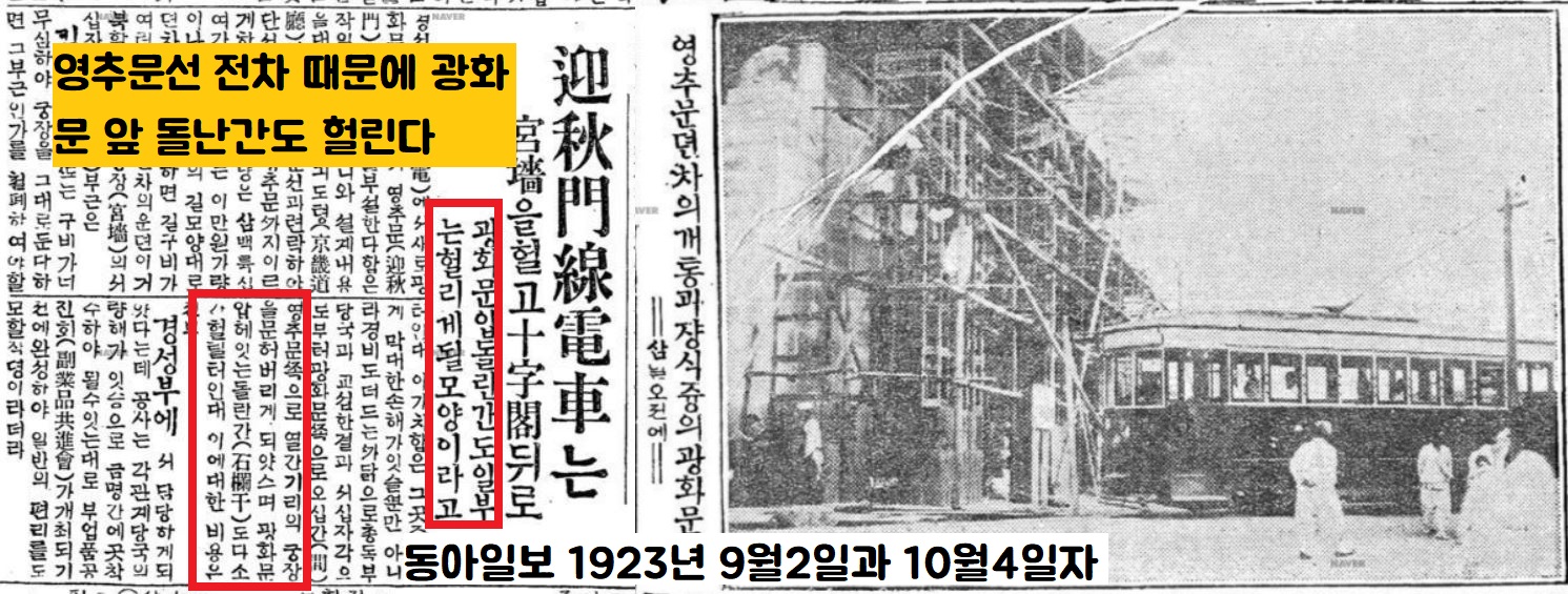 “경복궁 영추문~광화문 사이에 전차를 부설할 예정이어서 광화문 앞 돌난간을 헐어버릴 것”이라는 기사다. 돌난간은 월대를 지칭한다. 이듬해(1924년) “광화문에서 중학동~안국동에 이르는 길을 정비한다”(경성일보 7월1일)는 기사로 볼 때 이 무렵이면 완전히 헐린 듯하다. 일제강점기에 찍은 사진을 보면 그 무렵 헐린 월대의 부재들은 영제교(경복궁 흥례문~근정문 사이에 놓인 다리)의 천록(상상의 동물 조각상) 뒤쪽에 몰아두었다는 사실을 알 수 있다.