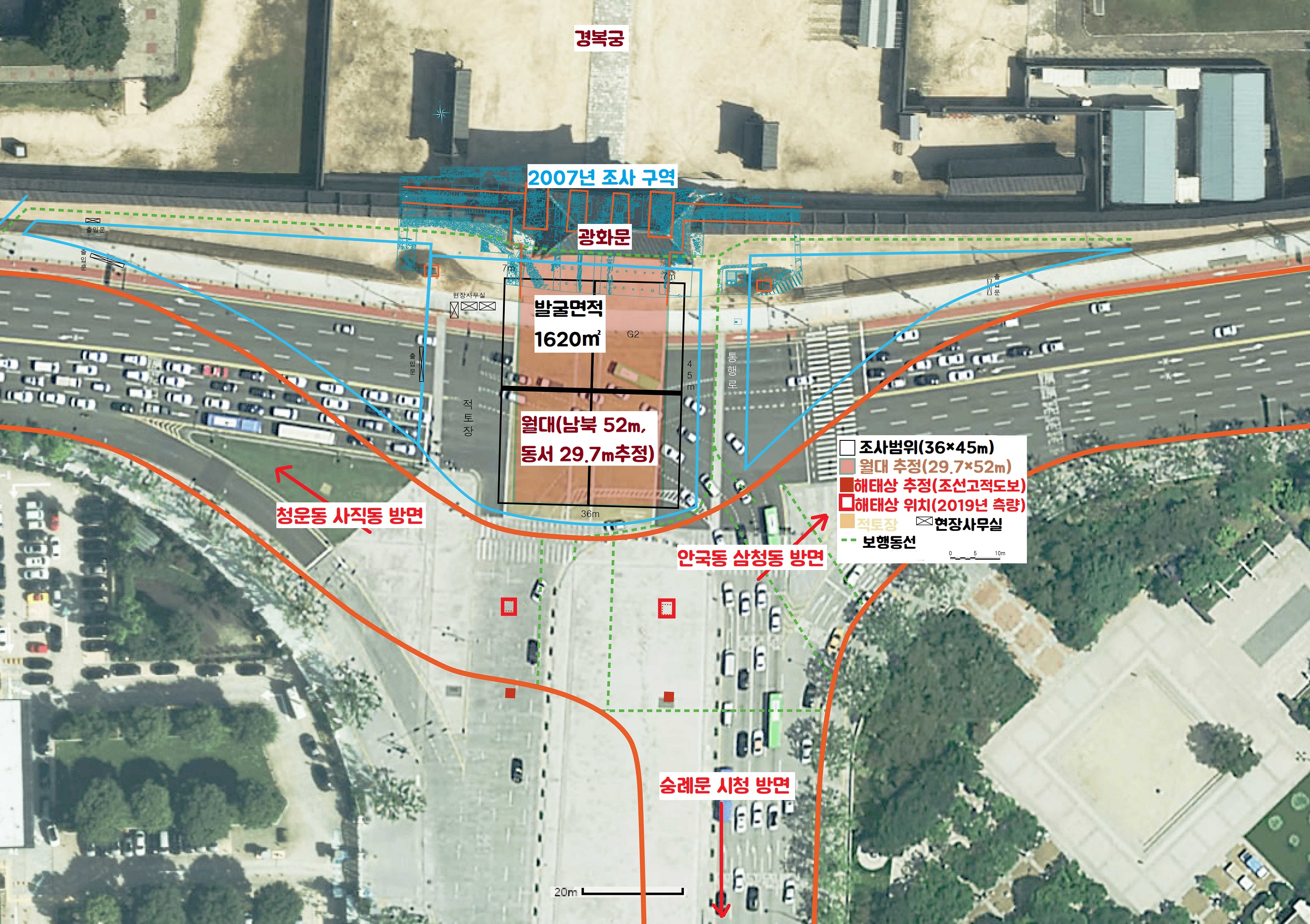 광화문 남쪽으로 11m까지 나아가 조사를 벌인 결과 고종 연간에 중건한 월대 유구(길이 8.3m, 폭 29.7m)가 확인됐다. 문화재청은 그 결과를 토대로 현재 광화문 앞에 월대의 일부를 복원해놓았다. 이때 건청궁과 국립민속박물관 사이에 방치되어 있던 난간석주(난간 돌기둥) 1점을 복원 부재로 활용했다. 정현정 문화재청 궁능유적본부 주무관은 “발굴성과를 토대로 보면 월대의 남북 길이는 52m, 동서 너비는 29.7m, 그리고 임금의 길인 어로의 너비는 5.2m로 추정된다”고 밝혔다.
