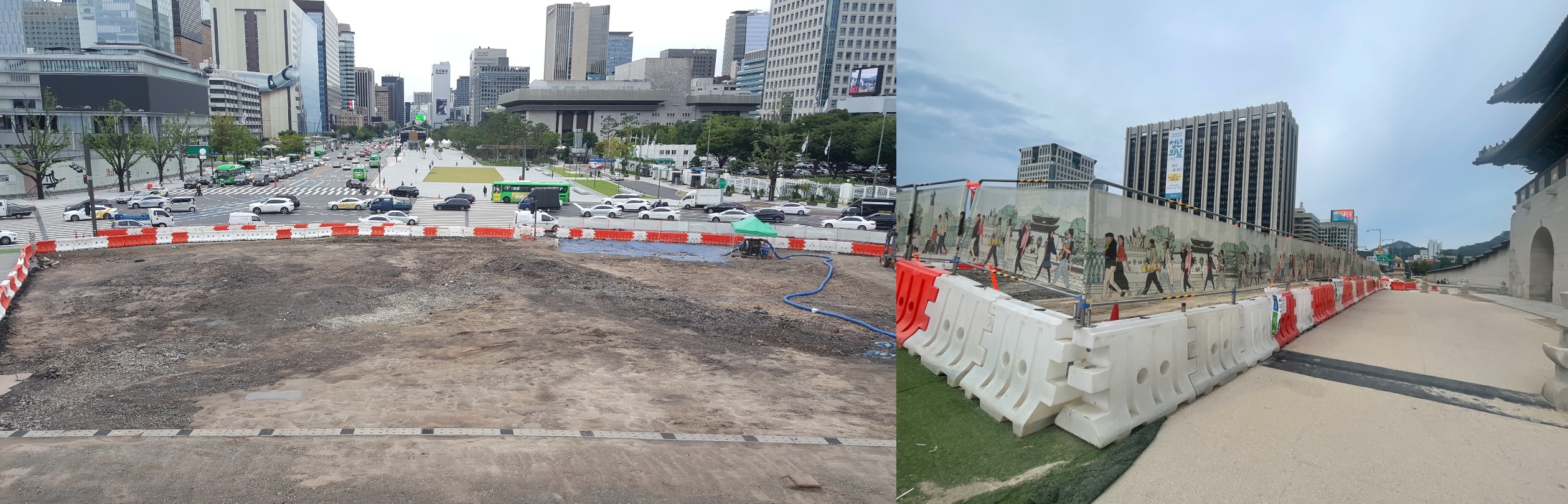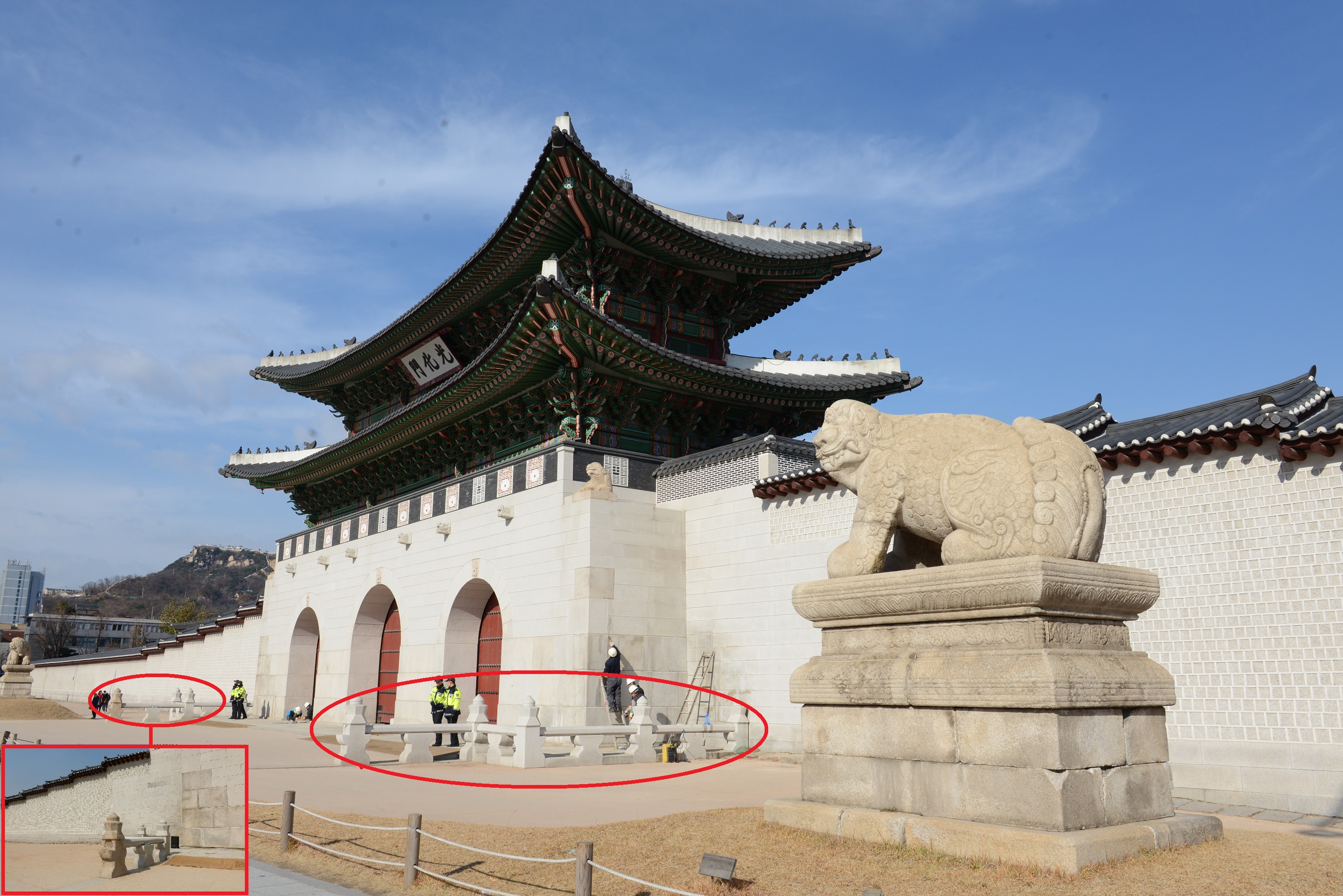 그런데 오랜만에 광화문 앞을 지나는 사람들이라면 좀 이상하게 생각할 법 하다. 사직동에서 안국동으로 이어지는 광화문 앞 도로가 반달 모양으로 휘어졌고, 또 최근에는 그마저 높은 울타리로 막아놓았기 때문이다.