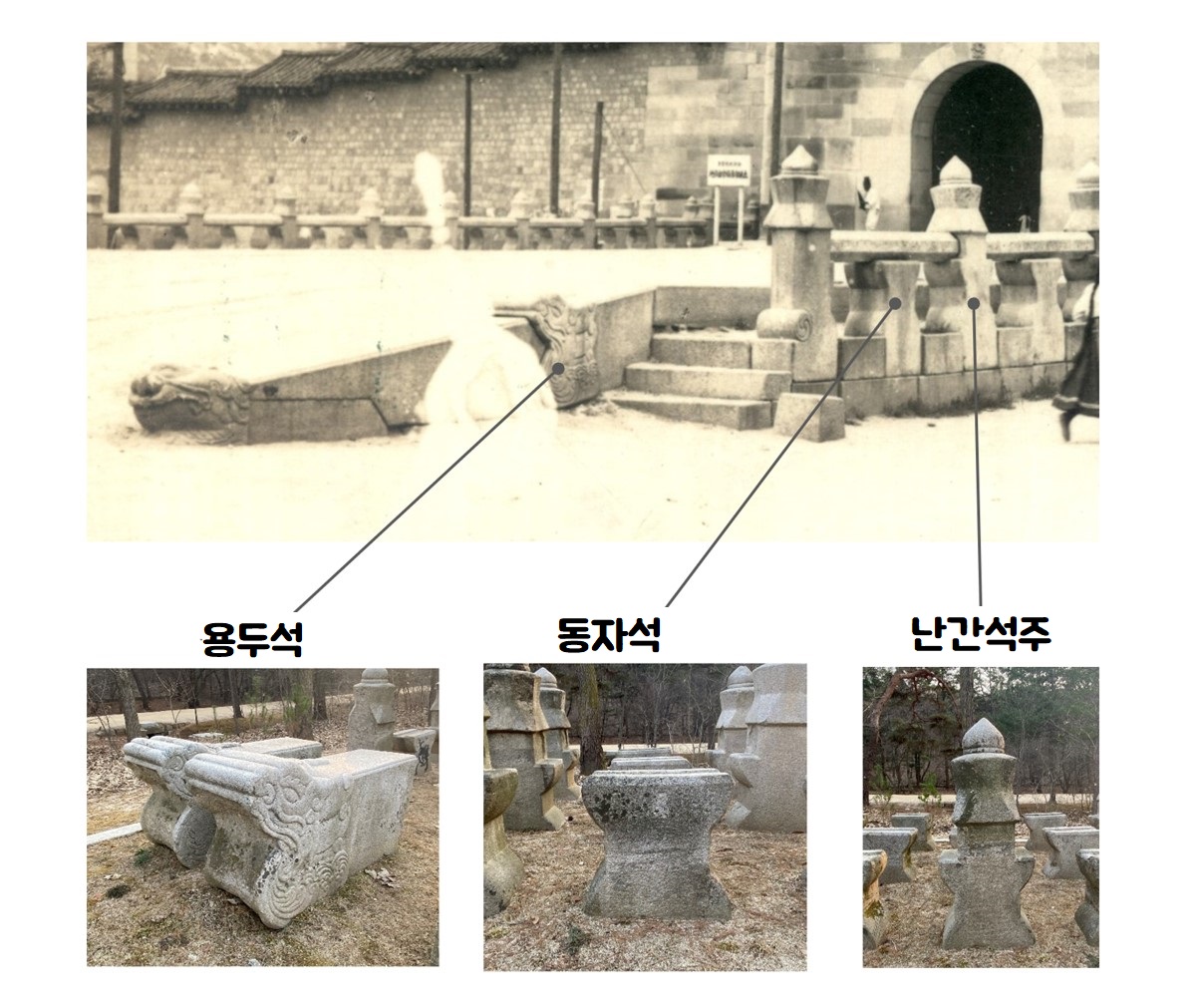 동구릉 마당 쪽에 쌓여있던 난간석주(난간에 쓰인 돌기둥) 18점과 동자석 20개, 용두석(용머리형 돌)이었다. 난간석주의 경우 현재 광화문에 일부 복원해놓은 월대의 돌기둥 1기와 너무도 흡사했다.