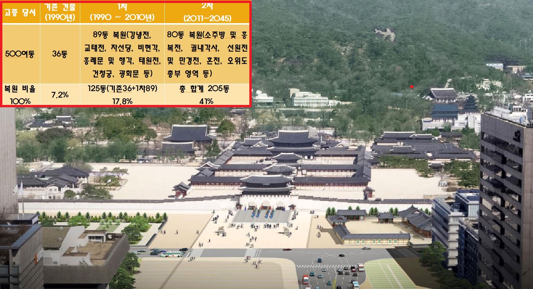 1990년 첫 삽을 뜬 ‘경복궁 복원’은 2045년까지 장장 55년의 기간을 두고 진행하는 사업이다. 중건 당시의 전각(500동) 가운데 1990년까지 남아있던 건물은 36개 동에 불과했다.