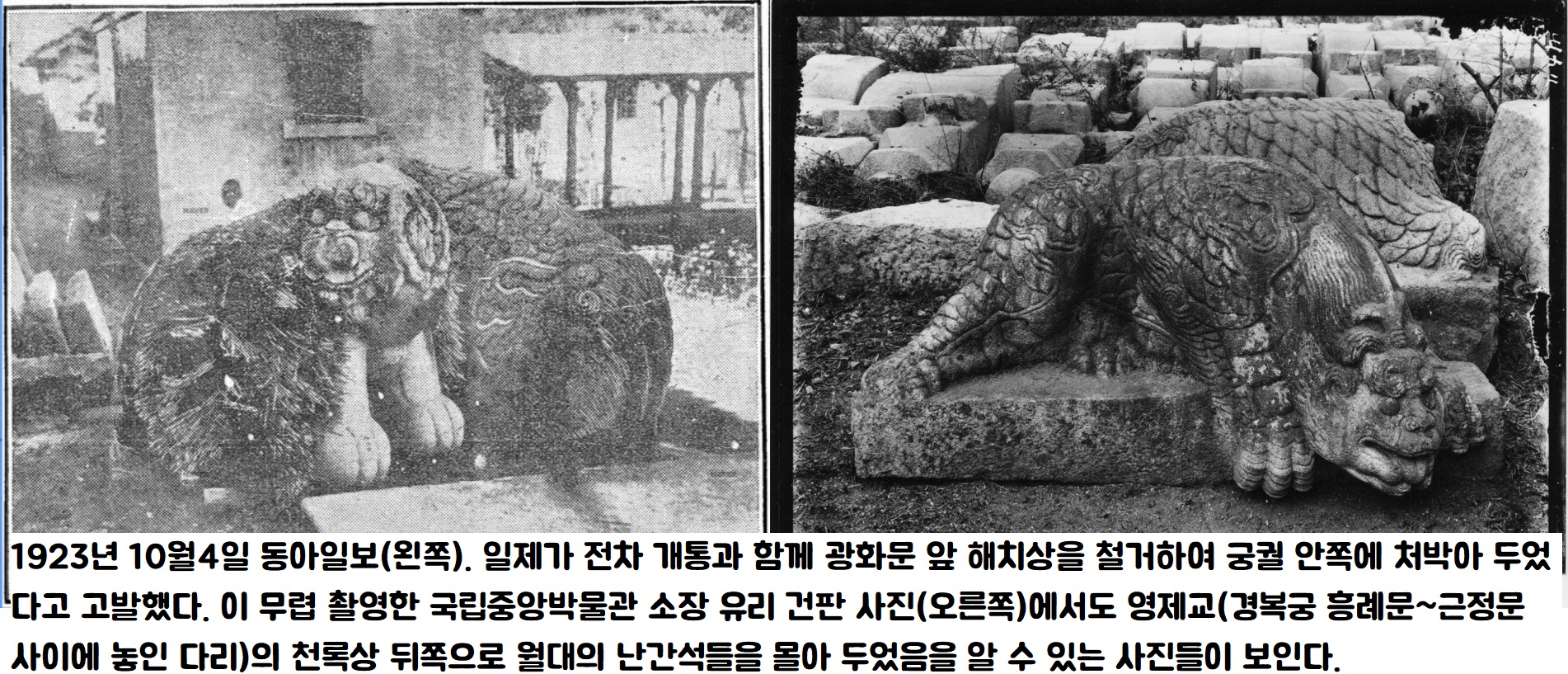 “경복궁 영추문~광화문 사이에 전차를 부설할 예정이어서 광화문 앞 돌난간을 헐어버릴 것”이라는 기사다. 돌난간은 월대를 지칭한다. 이듬해(1924년) “광화문에서 중학동~안국동에 이르는 길을 정비한다”(경성일보 7월1일)는 기사로 볼 때 이 무렵이면 완전히 헐린 듯하다. 일제강점기에 찍은 사진을 보면 그 무렵 헐린 월대의 부재들은 영제교(경복궁 흥례문~근정문 사이에 놓인 다리)의 천록(상상의 동물 조각상) 뒤쪽에 몰아두었다는 사실을 알 수 있다.