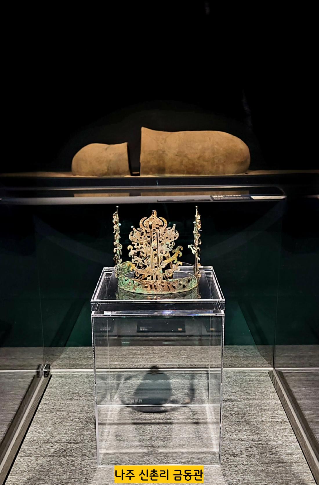 박물관 전시장 한편에는 나주 영산강 유역의 대표 유물인 신촌리 금동관 전용공간을 마련했다. 금동관이 출토된 신촌리 9호분 을관을 배경으로 배치했다.|국립나주박물관 제공