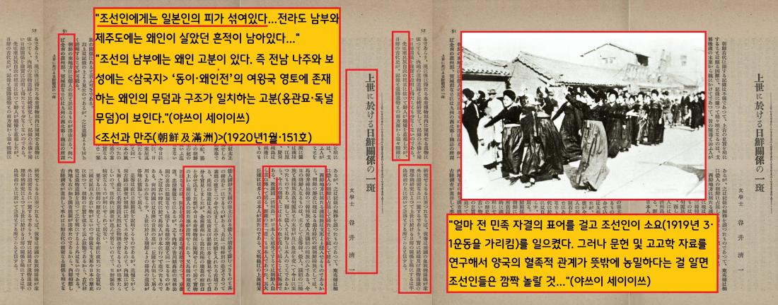 “얼마전 민족 자결의 표어를 걸고 조선인이 소요(1919년 3·1운동을 가리킴)를 일으켰다. 그러나 문헌 및 고고학 자료로 볼 때 양국의 혈족적 관계가 그렇게 농밀하다는 걸 알면 조선인들은 깜짝 놀랄 것….”
