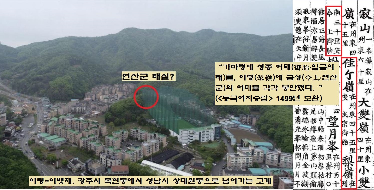 보고서를 읽은 필자의 시선이 머문 쪽이 있었다. 이번에 연산군의 태를 묻은 곳으로 처음 지목된 이령(梨嶺·경기 광주시 목현동 골프연습장 일대)이었다. 이령은 광주시 목현동에서 성남시 상대원동으로 넘어가는 고개이다. 현재 지명은 이뱃재이다.