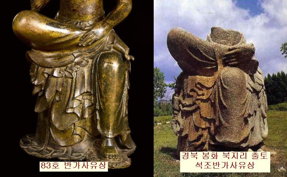 그러나 장식은 없지만 강렬한 인상을 주는 세 개의 반원을 이어붙인 양식은 신라지역에서 주로 보인답니다. 경주 단석산 신선암 마애반가사유상, 황룡사 출토 금동반가사유상 머리편, 경주 성건동 출토 금동반가사유상 등이 대표적인데요. 또 83호와 비교 대상인 조각상은 경북 봉화 북지리 출토 석조반가사유상(보물)과, 앞서 인용한 고류지 목조반가사유상(일본 조각부문 국보 1호)이 있어요.