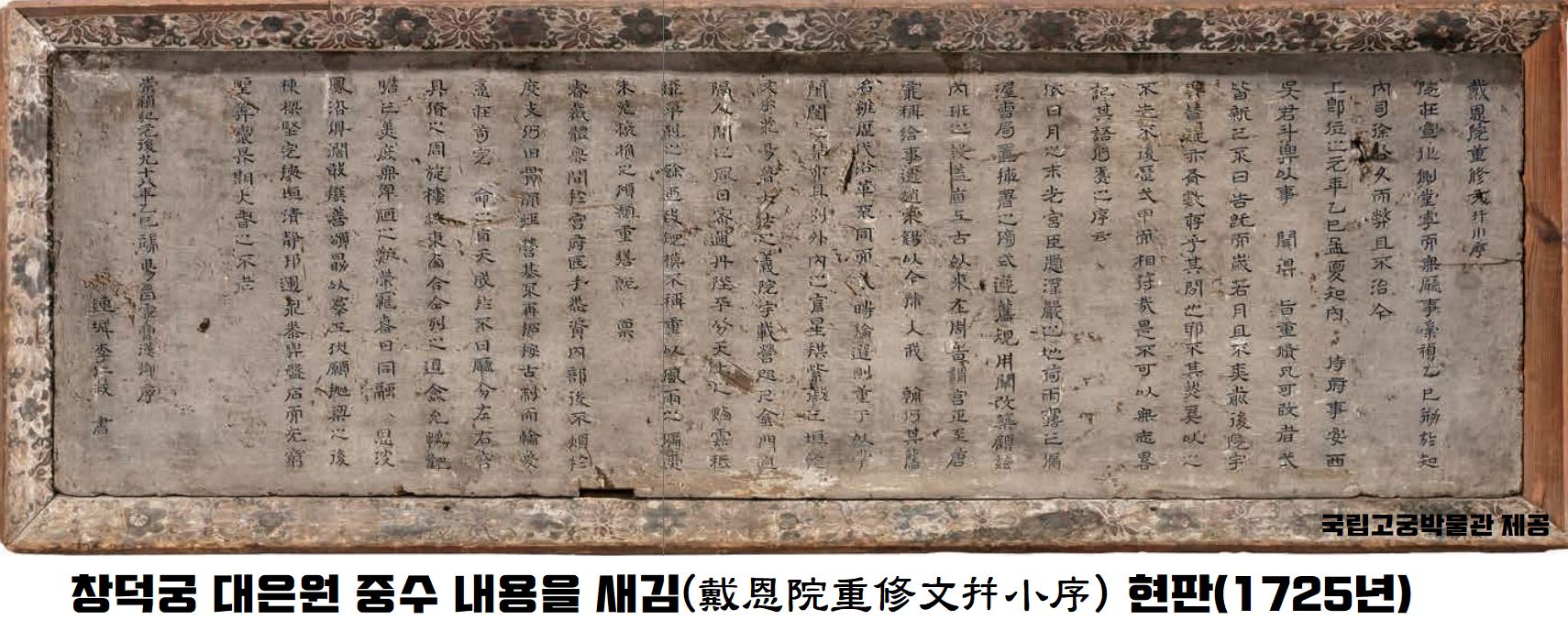 1725년 대은원이라는 전각을 수리한 내역을 새긴 건데요. 그런데 수리공사를 지휘한 것도 내시이요, 현판의 글을 지은 것도 내시이고, 글씨를 쓴 것도 내시였습니다. 아마 내시들이 머물렀던 건물이니 내시들이 수리공사의 모든 책임을 진 거죠. 그러나 내시가 궁궐 전각의 현판을 썼다는 것은 지극히 예외적인 사례였죠.