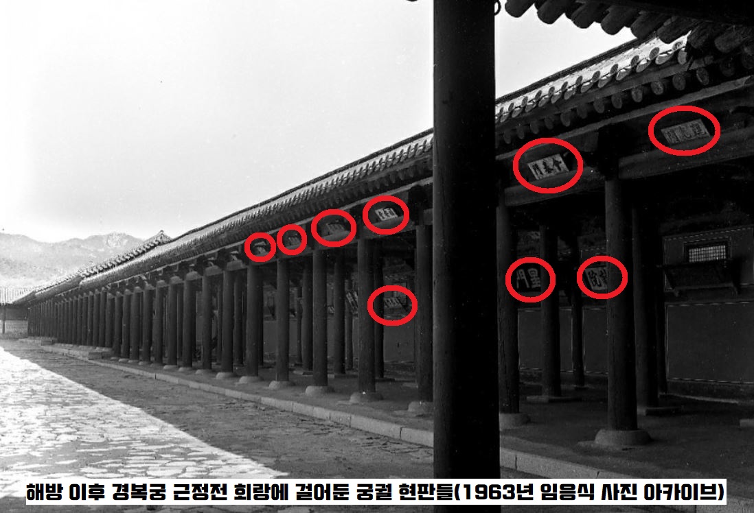 이때 현판들도 뿔뿔이 흩어져서 창경궁의 각 전각의 각 칸마다 매달리게 됐구요. 천덕꾸러기가 된 현판들은 해방 이후에도 경복궁 근정전 회랑과 사정전, 천추전 등의 전각에서 보관됐습니다. 그러다 이런저런 이유로 창경궁 장서각(1981년)-창덕궁 인정전 서행각(1986년)-덕수궁 궁중유물전시관(1992년)-국립고궁박물관(2005년) 등을 전전했구요.