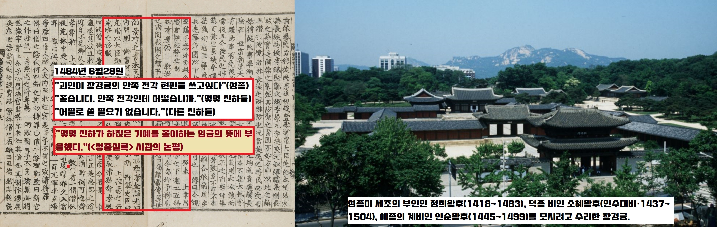 1484년(성종 15) 6월28일 “(막 창건한) 창경궁 내간(부녀자가 거처하는 방)의 전각 현판은 과인이 직접 쓰고 싶다”고 운을 뗍니다. 어떤 이들은 “좋다”고 찬성했지만, 다른 이들은 쌍심지를 켜고 “어필로 할 필요가 없다”고 달려듭니다. <성종실록> 사관의 평가가 촌철살인입니다. “몇몇 신하가 하찮은 기예를 좋아하는 임금의 뜻에 부응했다”는 겁니다.