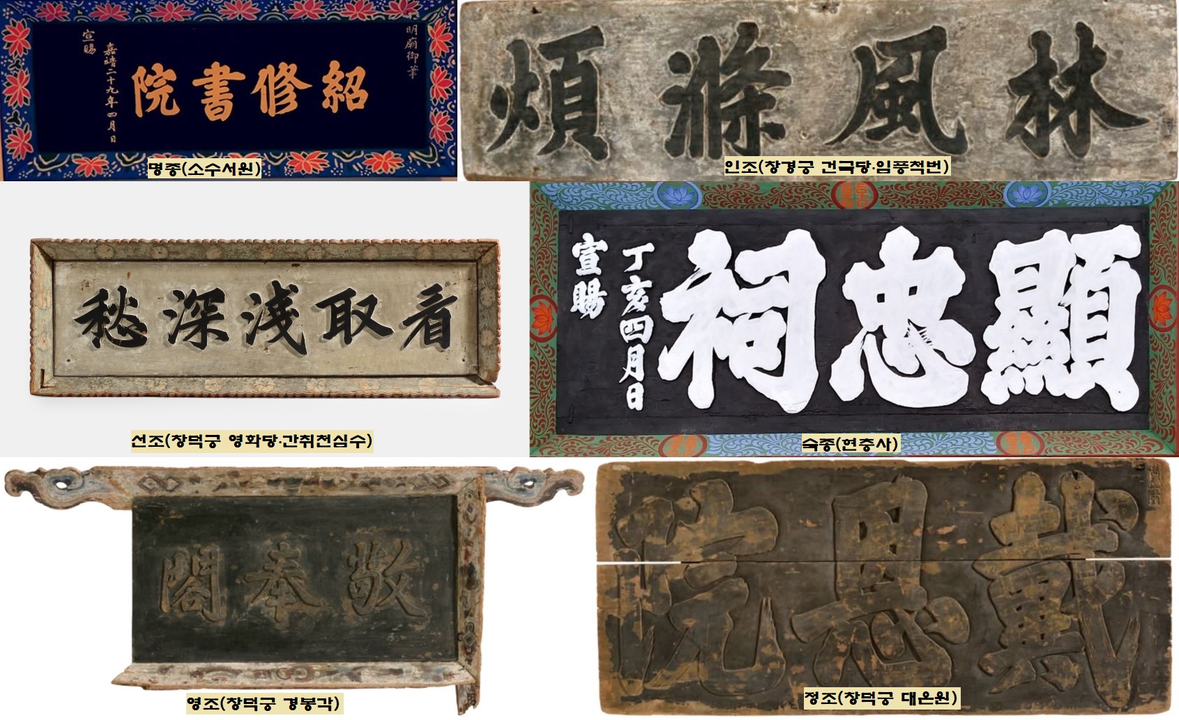 여기에는 반전의 이야기가 숨어 있습니다. 남아있는 어필·예필 현판이 모두 조선 후기의 것이죠. 선조의 글씨를 새긴 현판도 당시의 것이 아닙니다. 훗날 어필첩에 있는 선조의 글씨를 본떠서 새긴 겁니다. 물론 분명한 이유가 있죠. 어필·예필 현판은 물론이고, 조선 전기의 현판 자체가 임진왜란 같은 병란과 크고작은 화재 때문에 남아있지 않으니까요.