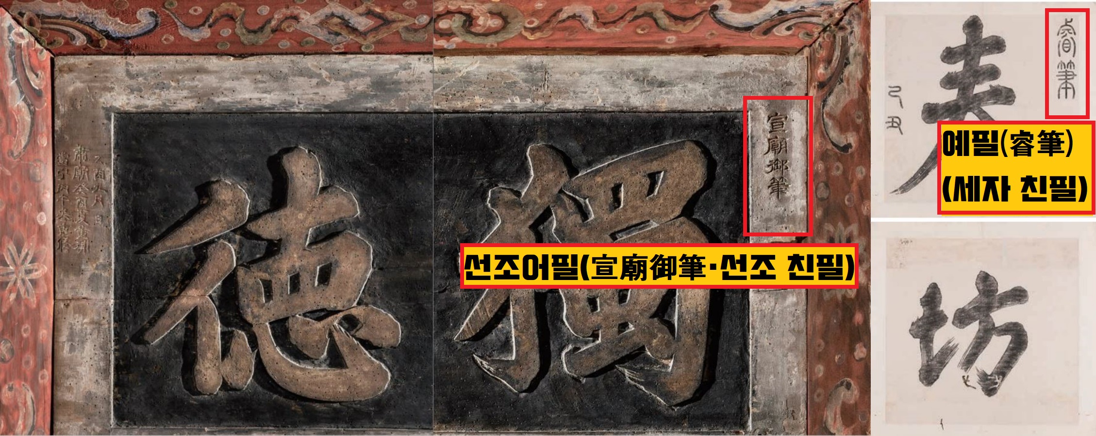 현판은 왕조의 상징물이고, 그 상징물의 간판이죠. 국왕의 글씨 혹은 당대 최고 명필들의 글씨를 받아 장인들이 정교하게 새겼고, 화려한 문양과 조각으로 장식했습니다. 이중 왕과 왕세자의 글과 글씨가 상당수 남아있는데요. 현판에는 특별히 작은 글씨로 어필(御筆·임금의 글씨), 예필(睿筆·세자의 글씨)이라고 새겼고, 각종 장식을 더했습니다. 지극히 존귀한 글씨임을 나타낸거죠.