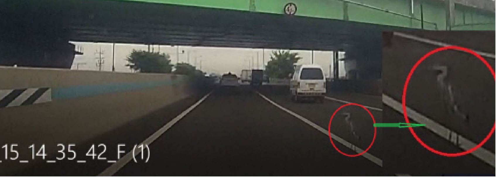 어떤 새인가 신용운 문화재청 천연기념물과 주무관에게 물어봤더니 ‘왜가리’라 하더군요. 신용운 주무관 이야기로는 요즘이 왜가리 번식기인데, 태어난지 얼마 안되거나 덜 자린 왜가리의 경우엔 제대로 날지 못해 걸어다니거나 서있는 경우가 았다고 하네요. 지쳐서 날지 못하는 경우일 수도 있다네요. 신용운 주무관은 “블랙박스 영상으로 봐서는 왜가리가 성조인지, 유조인지는 구별하기 힘들다”고 하네요.