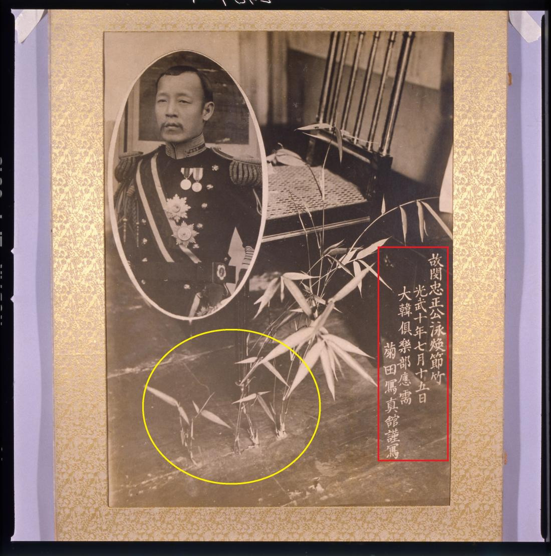 민영환 선생이 자결순국할 때 입었던 ‘피묻은 옷’과 사용한 ‘칼’을 보관했던 방안에서 자라난 대나무. 방바닥 틈새로 솟아났다. 사진 오른쪽엔 ‘광무 10년(1906년) 7월15일 대한구락부의 의뢰를 받은 기쿠다(菊田) 사진관(일본인 운영)이 고 민충정공의 절죽(節竹)을 찍었다’는 기록이 있다.|고려대박물관 제공