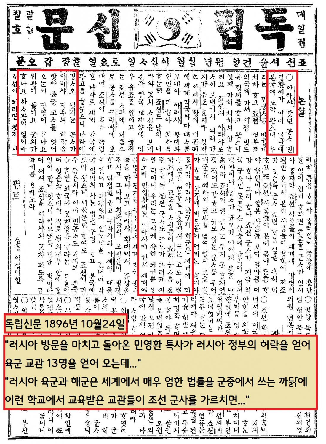 빈손으로 귀국할 수 없었던 민영환 특사는 공식일정 후에도 처절한 외교교섭을 벌였고, 결국 조선군을 양성할 13명의 러시아 군사교관들과 함께 귀국했다. 독립신문은 조선군을 키울 러시아 군사교관의 입국을 환영하는 논설을 실었다.