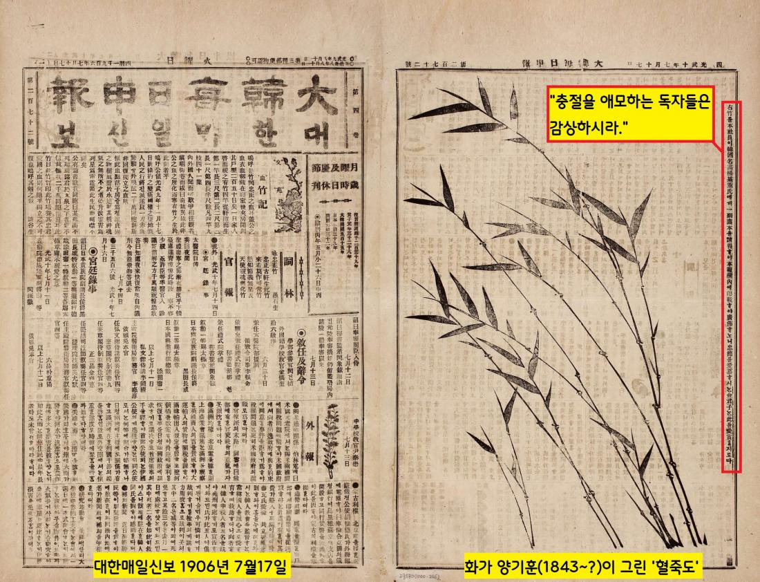 대한매일신문 1906년 7월17일자는 화가 양기훈(1843~?)이 그린 ‘혈죽도’를 게재하면서 “충절을 애모하는 독자들은 감상하라”고 했다.